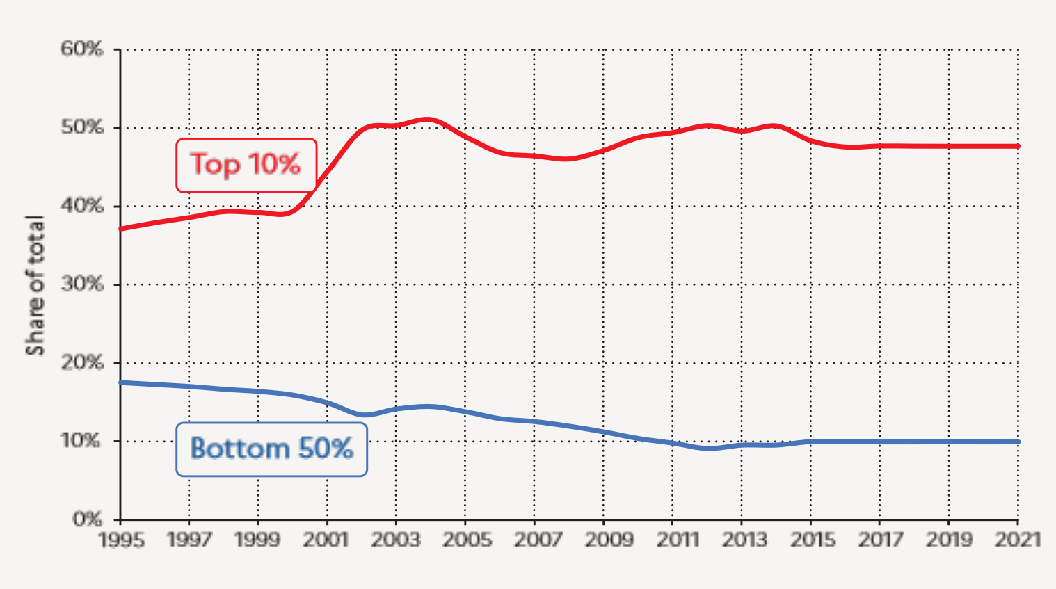 | Fascia sociale | Percentuale della popolazione | Percentuale di ricchezza posseduta nel 1995 | Percentuale di ricchezza posseduta nel 2021 |