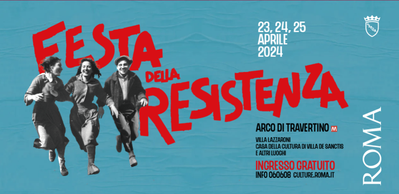 La Festa della Resistenza di Roma 2024 è promossa e sostenuta dall’Assessorato alla Cultura di Roma Capitale, con la collaborazione dei Municipi V e VII, dell’Istituzione Biblioteche di Roma, delle Associazioni della Casa della Memoria e della Storia, dell’Archivio Flamigni, dell’Associazione Cittadini del Mondo e delle reti di Associazioni culturali e territoriali Q44 e Ottava Zona – Memoria Est.