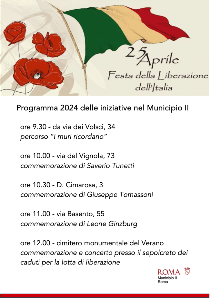 – ore 12.00 presso il cimitero monumentale del Verano, Commemorazione e concerto presso il Sepolcreto dei caduti per la lotta di liberazione.