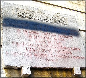QUI NEI TRISTI GIORNI DELL’OCCUPAZIONE TEDESCA (11-9-43 ) A ETERNA ONTA DEI RESPONSABILI FUGGENTI IN UN NOBILE DISPERATO TENTATIVO DI RESISTENZA ARMATA CADDE DA PRODE COLPITO DALLA RABBIOSA MITRAGLIA NAZISTA TOMASSONI GIUSEPPE A IMPERITURO RICORDO LA FAMIGLIA E I COMPAGNI POSERO