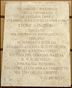 UN AGGUATO POLIZIESCO NELLA TIPOGRAFIA DE “L’ITALIA LIBERA” STRAPPAVA ALLA LOTTA CLANDESTINA LEONE GINZBURG ITALIANO PER PASSIONI DI RISORGIMENTO EUROPEO DI PENSIERO E D’IDEALI. ERA NATO AD ODESSA IL IV.IV.MCMIX MORI’ A REGINA COELI VITTIMA DEL TERRORE NAZISTA IL V.II.MCMXLIV. VIVA LA SUA MEMORIA NEL CUORE DI CHI SPERA E COMBATTE PER UNA GIUSTA LIBERTA’