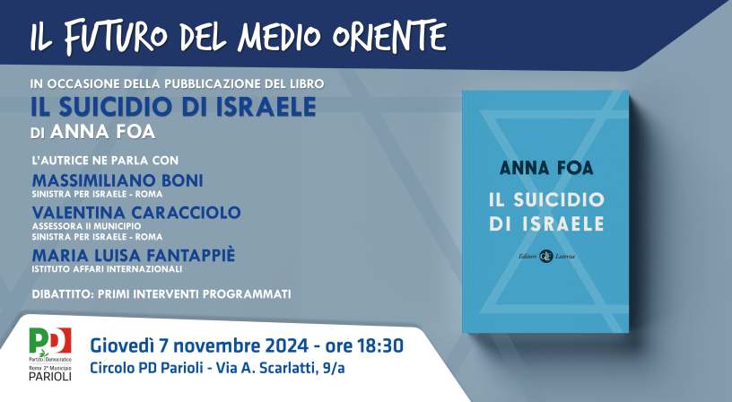 in occasione della pubblicazione del libro “Il suicidio di Israele”, Laterza 2024, di Anna Foa, grazie alla collaborazione con Sinistra per Israele, sezione di Roma, abbiamo organizzato un’occasione di confronto con l’autrice su un conflitto straziante, che ha radici lontane e che tocca nel profondo l’animo di tutti noi per le atrocità perpetrate e le scelte politiche discutibili, a cui sembra impossibile porre fine.