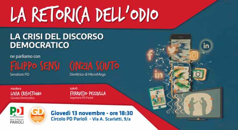 Il Circolo Parioli, insieme ai Govani Democratici del 2° Municipio, ha organizzato un incontro di approfondimento: l’analisi si concentrerà su come la banalizzazione del dibattito politico, la riduzione di temi complessi a slogan binari e superficiali, consenta questa inversione di colpa. Etichettando ogni forma di opposizione vigorosa come “odio”, si ottiene il duplice risultato di silenziarla e di posizionare gli accusatori in una presunta superiorità morale.