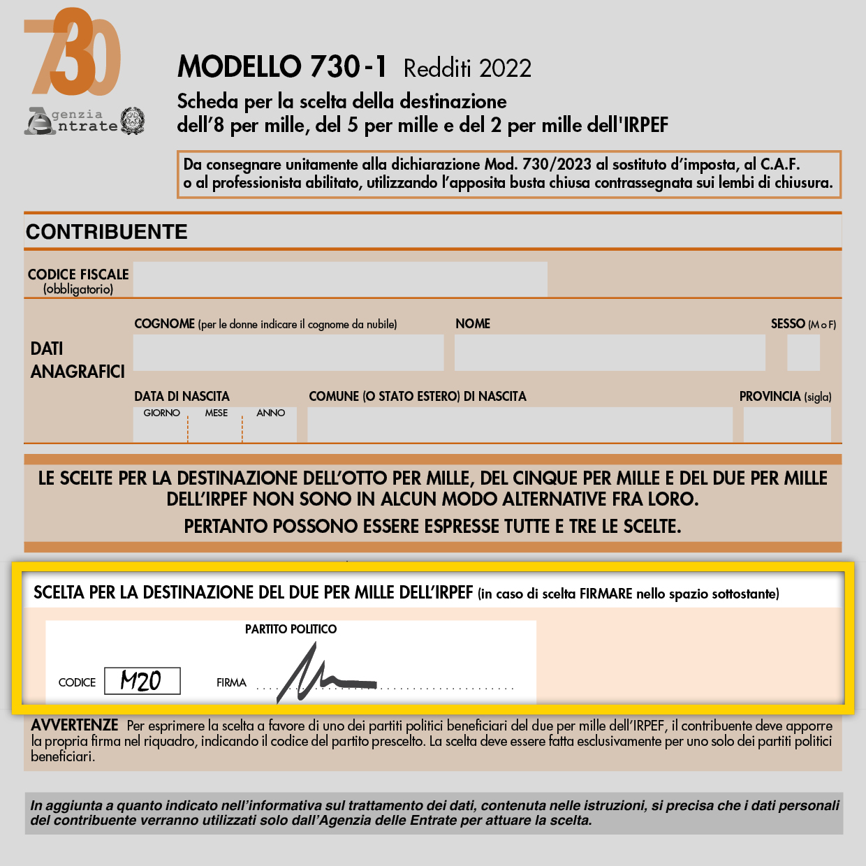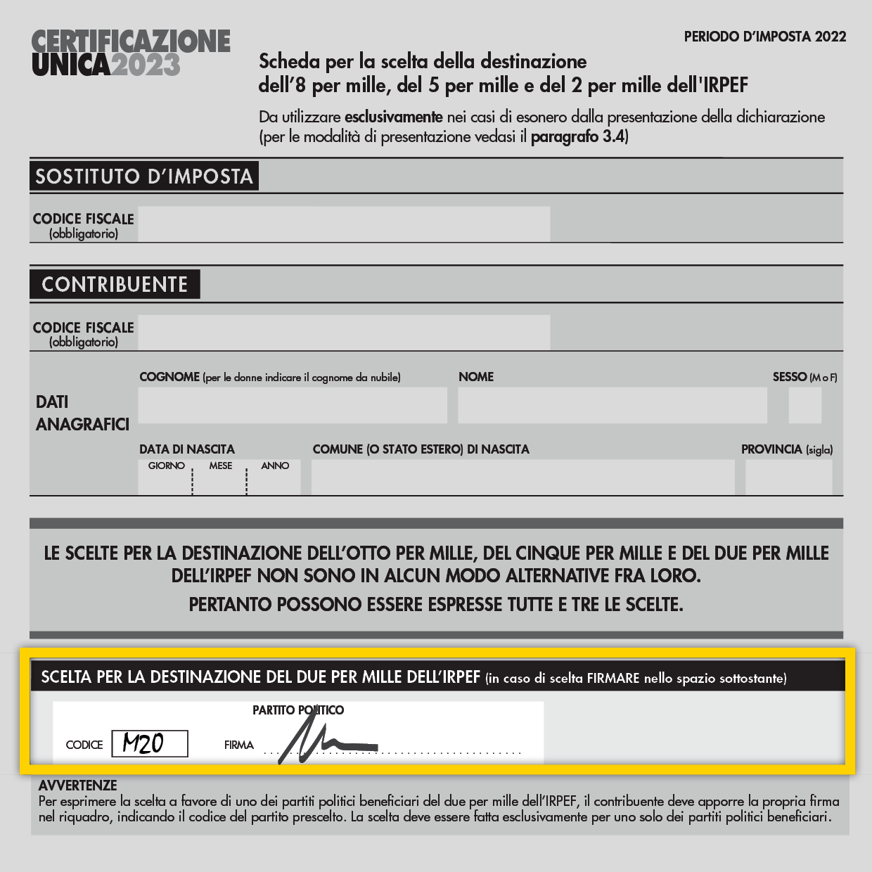 Scrivi M20 nello spazio dedicato al 2×1000 della tua dichiarazione dei redditi e firma accanto.